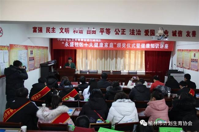 12月28日,榆林市计生协携手横山区计生协、白界镇计生协及白界镇永盛社区计生协,联合在永盛社区举行了“永盛社区十大健康家庭”颁奖仪式暨健康知识讲座。市、区、镇、社区计生协工作者、永盛社区十大健康家庭代表、居民代表等50多人参加活动。